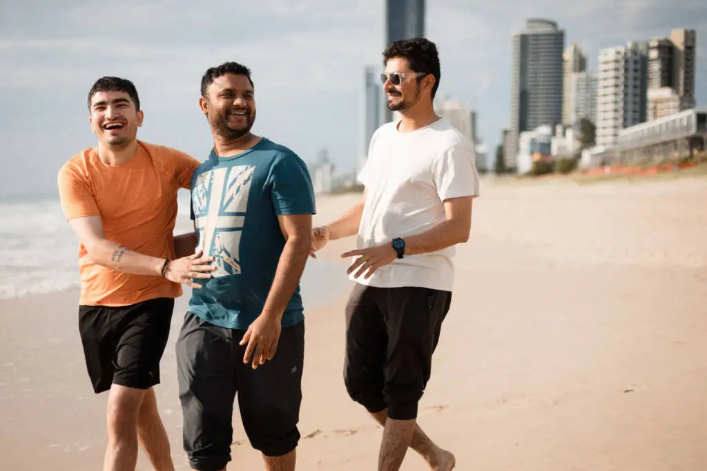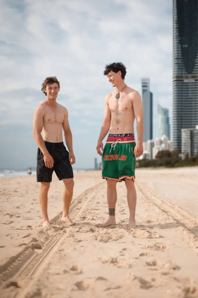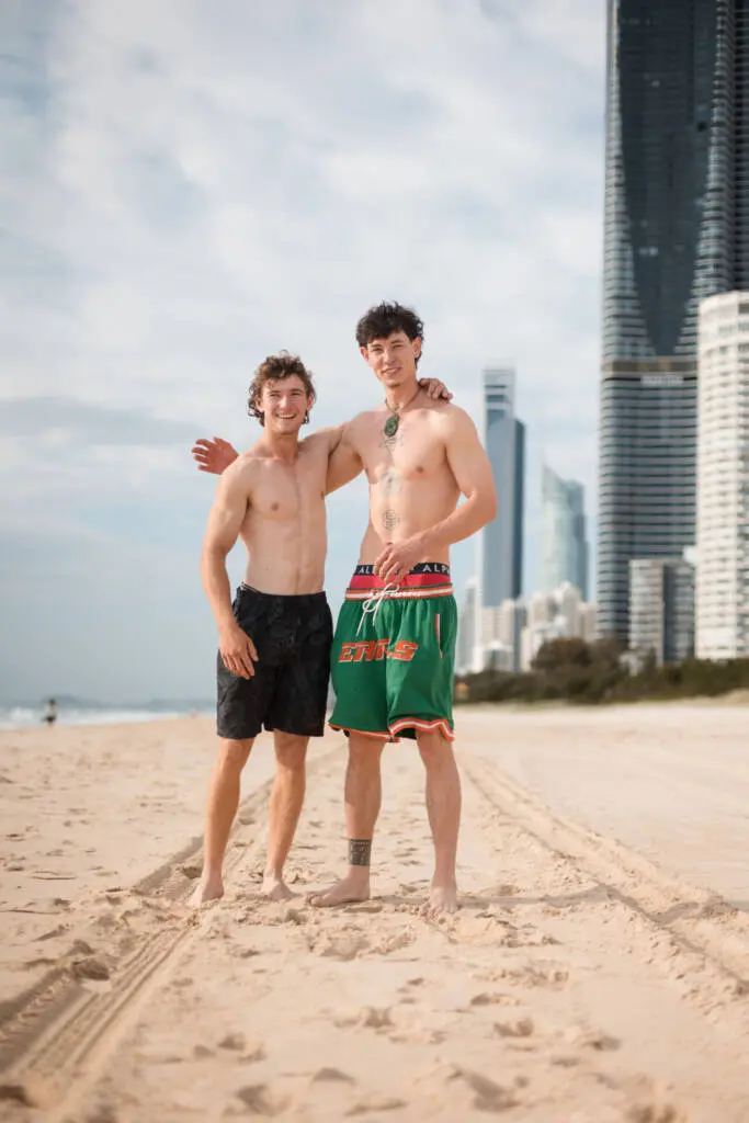 While I kicked myself for not talking to Daniel or the group of friends I’d photographed before him a bit more, I strengthened my resolve and continued to press forward to try again. And there I met two young men or as Aussies would say, blokes, walking towards me. They were walking in between two tire tracks made in the sand and were literally splitting the scene of a giant metropolis to the right and a serene beach and ocean to the left. This natural composition got me curious about who these two young men were and why they were walking along the beach at 7:00 in the morning on a Friday.
