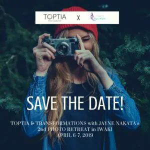 TopTia Photography is once again partnering with Transformations with Jayne Nakata for our second photo retreat! Six to eight ladies can come together with cameras -or smartphones- of their choice. We’ll spend a two day- one night retreat in the relaxing town of Iwaki, Fukushima to learn photography tips such as: